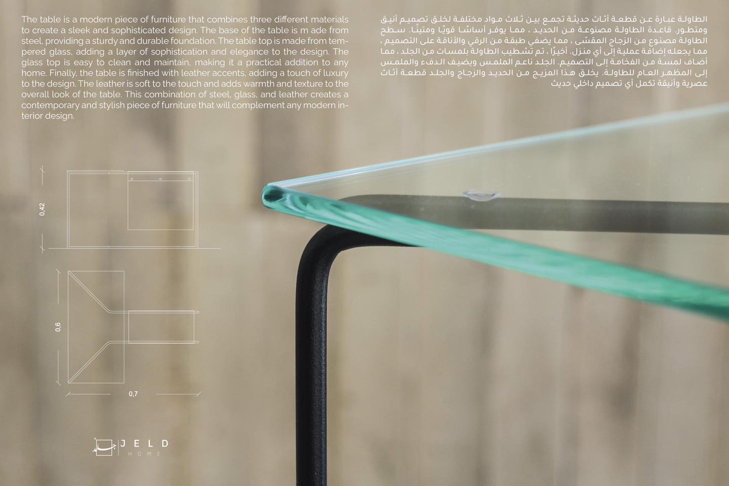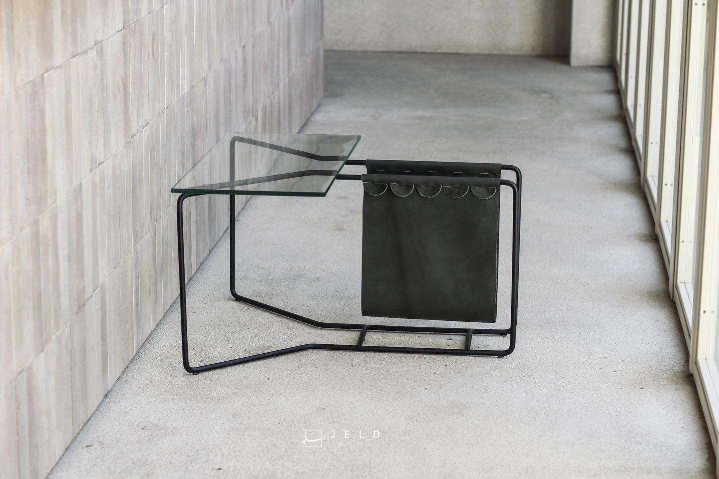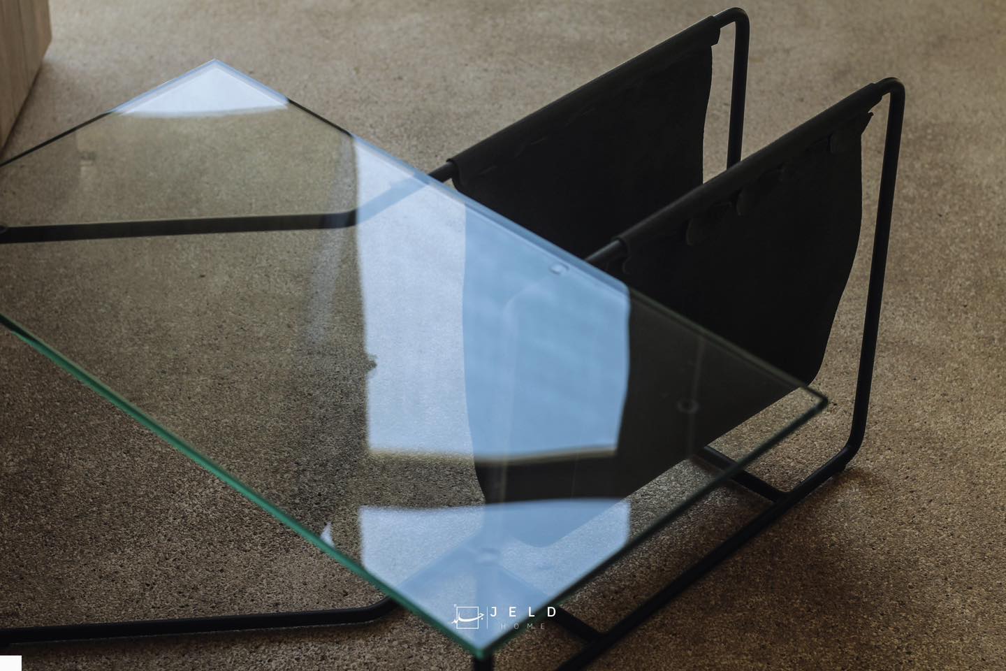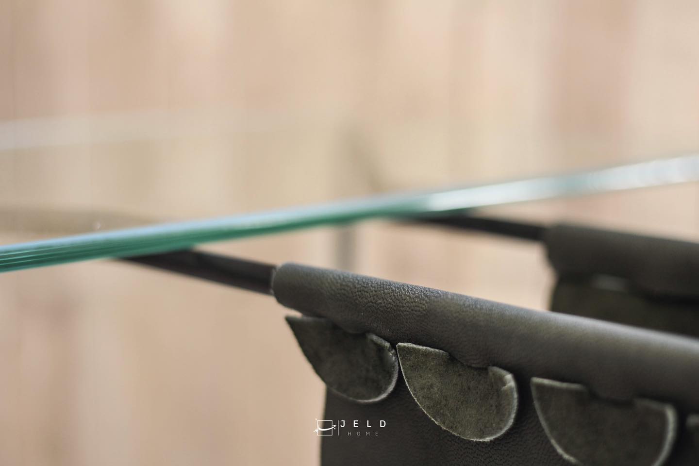 The Olive Table is made of a combination of powder coated steel & vegetable-tanned cow hide topped with tempered glass.